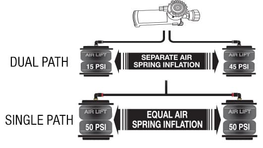On the flip side, if you generally haul loads with an even weight distribution, you might like the single-path compressor system. The difference is that it will adjust your air springs simultaneously, ensuring that you don’t needlessly inflate or deflate them unevenly.